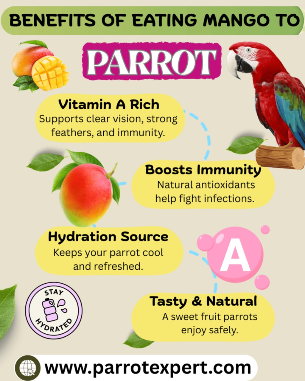 As per dietary expert, mangoes are in lot of C (36.4 mg) that help in strengthening their immune systems. Lazy and prone to infection are parrots with compromised immune systems. A robust immune system combats illnesses and pathogens.