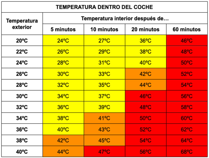 For this reason, leaving the dog alone in the car is dangerous , and the more time it spends inside it, the more the temperature inside it will increase and the worse it will be. Next, we leave a table with the equivalences of exterior temperature, time and interior temperature that cars can have.