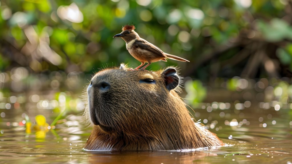 Capybaras are famous for their tolerance of other species, often serving as living platforms for birds, monkeys, and even caimans. This behavior stems from their calm nature and the mutual benefits these relationships provide.