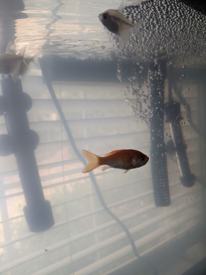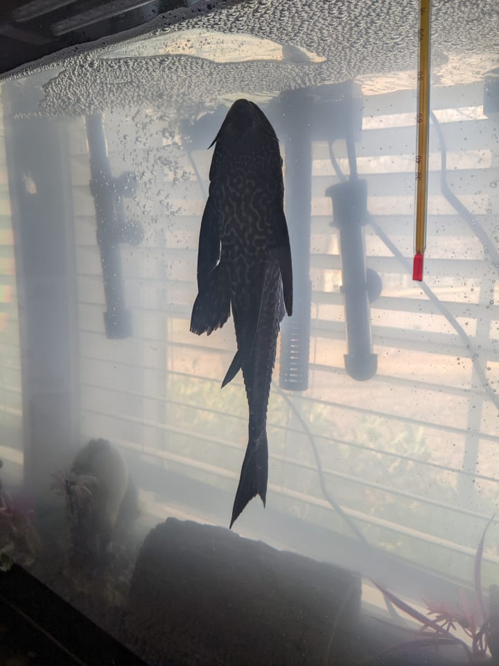 When I got her I had her with my goldfish. I had three goldfish at the time. They lived together peacefully and it worked. But as she grew more and more my goldfish died. They probably died from age. My algae eater fish lived and she kept growing. When I first got it my tank size was a 20gal. Then it kept growing and growing. It sucks on the side of the glass of the aquarium and it looks like a catfish.