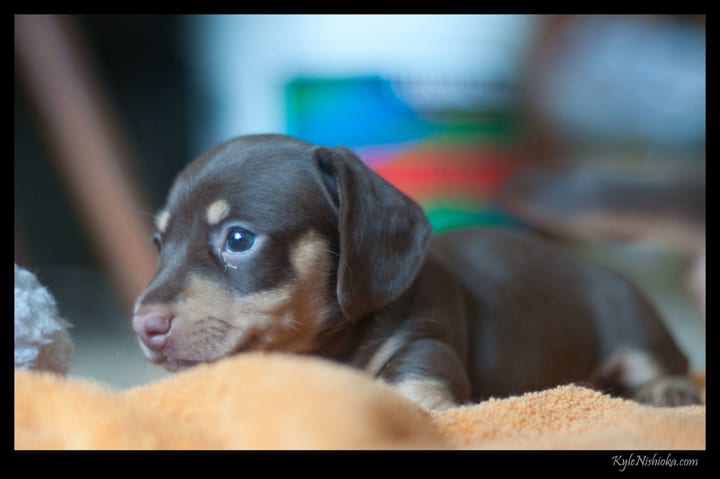 As long as she was outside, in the sunshine, she appeared to be a dark black. But, once she came inside, she looked all charcoal brown, except for her paws. All four of her feet had white patches that looked almost like socks. She was a cross-bred Daschund with a bit of Schnauzer mixed in that was visible just behind both ears and on her butt.