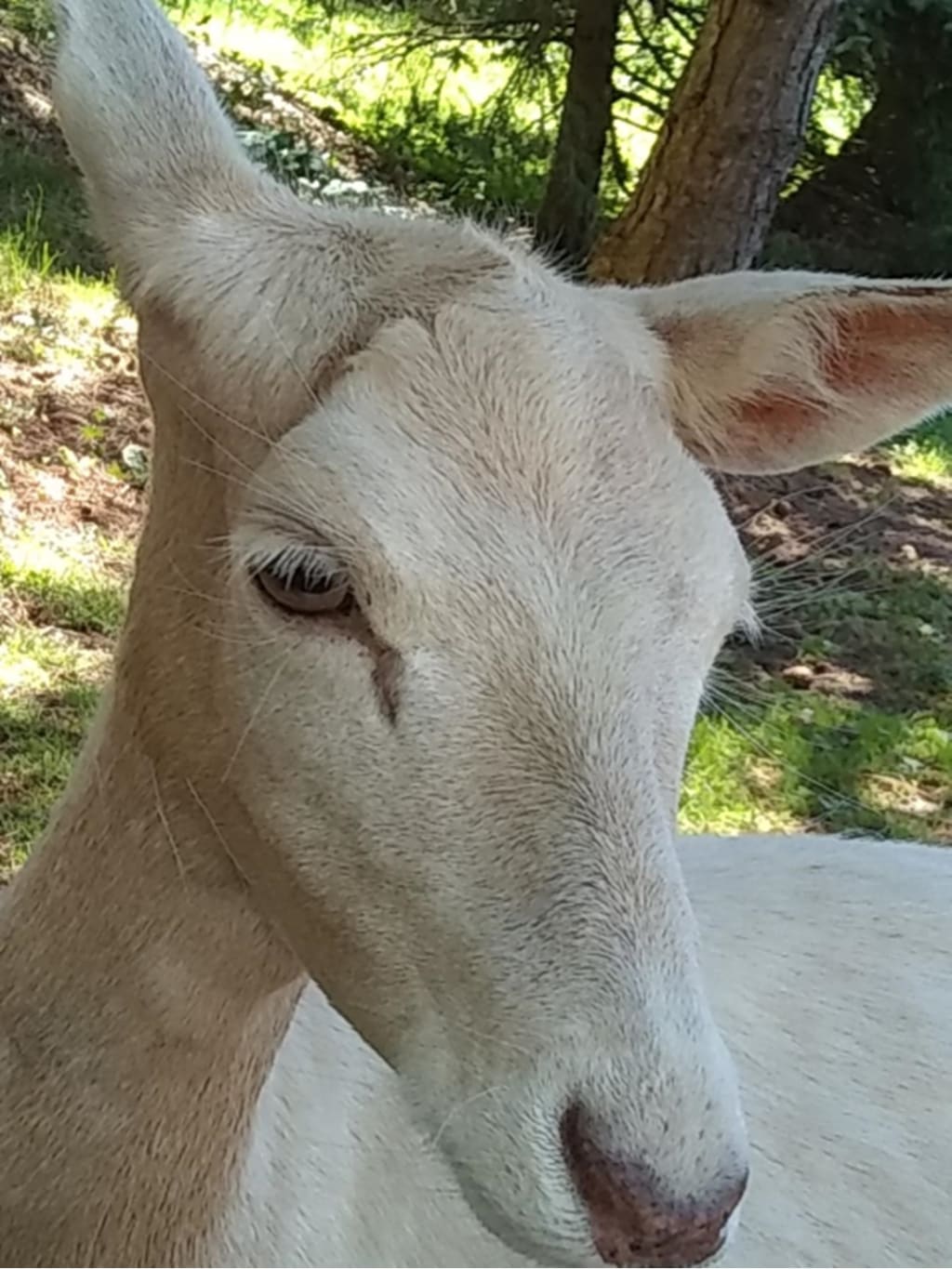 The White Deer is intelligent and has good survival instincts. As tame as she is, she is still wild, and knows when to protect herself. At any sign of a threat, she is off doing her prancing two step into the woods. During a storm, she protects herself under the awning of the roof, staying cozy and dry. She has increased her territorial radius to 8 square miles and as she travels, reported sightings go onto the internet. She has even made local news several times. She likes to attend special events. On a recent family birthday, which was held outside, under a tent, she came sauntering in just to be nosy and see what all the fuss was. The little party crasher was welcomed with open arms (from a distance of course.) and was the hit of the fiesta.