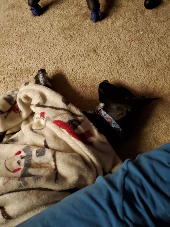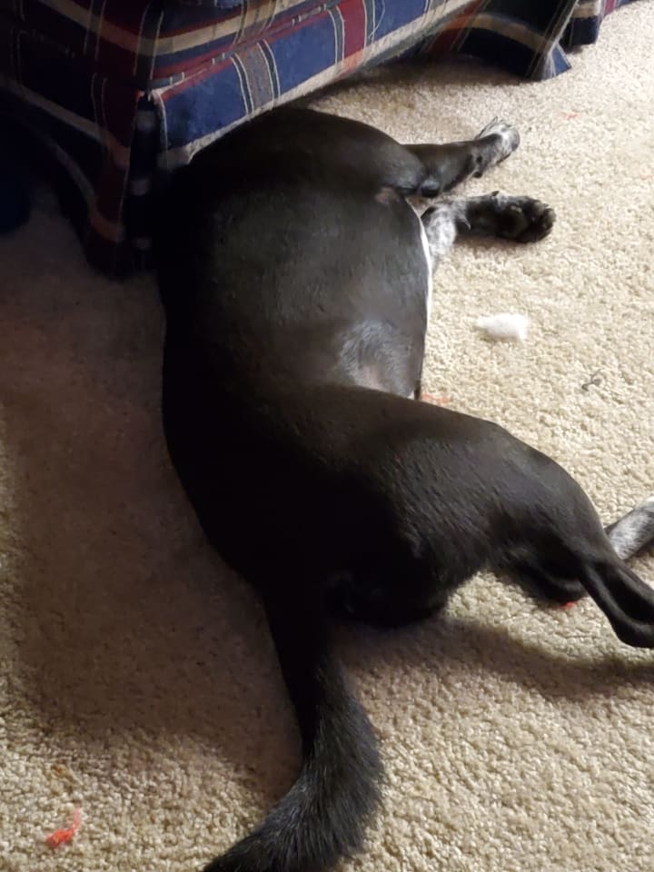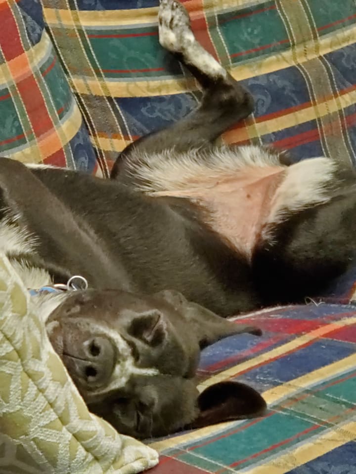 She's now been a part of our home for about a month and we've had some ups and downs, but she's finally starting to relax and trust us. She's come a long way from not being potty-trained at all and having zero socialization skills.