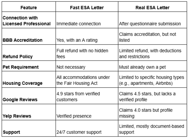 If you've narrowed your search down to Fast ESA Letter and Real ESA Letter, you're likely wondering which one is the better choice. Here, we’ll compare both services based on factors like customer reviews, credibility, refund policies, housing coverage, and after-service support. By the end, you’ll have a clearer picture of which service is the best for you.