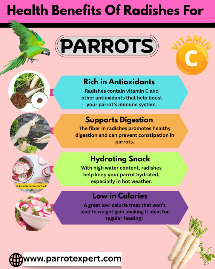 Radishes are juicy, nutrient-rich, and well-liked by many parrots. They contain antioxidants, calcium, potassium, and other nutrients that can benefit their health. Therefore, radishes are not only safe but also potentially beneficial for parrots when served in moderation.