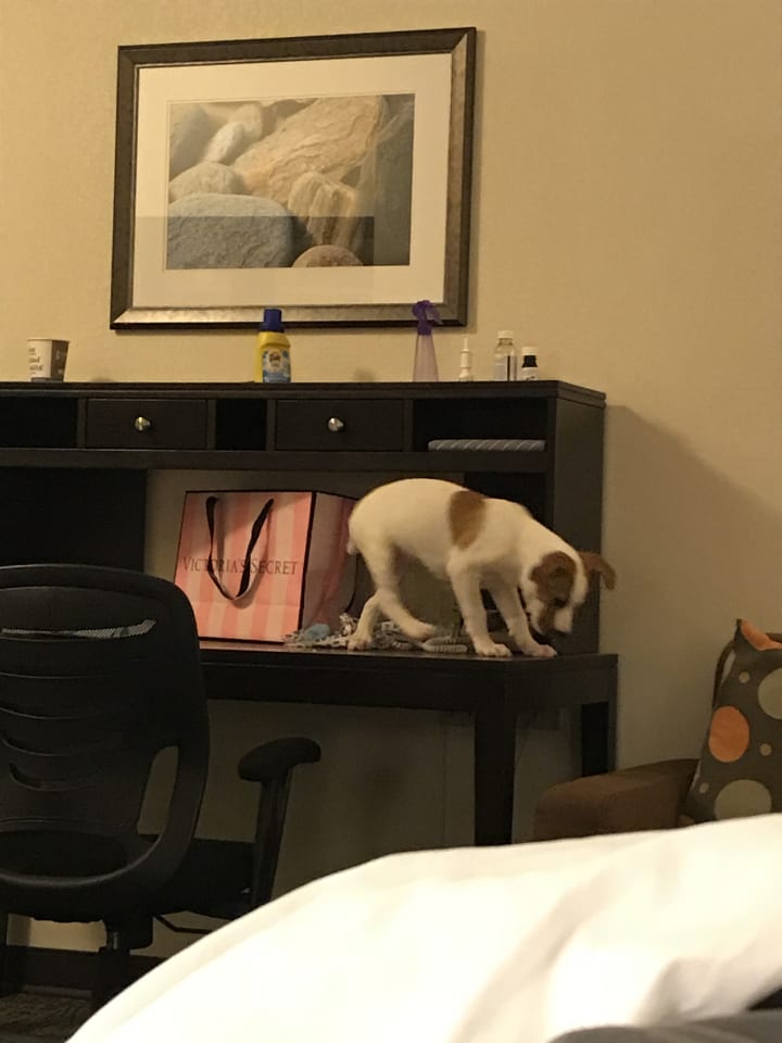 I was traveling for work and staying in hotels and, sadly, I had to leave him alone for way too long. I’d come home and see that he was so bored that he decided to tear up the carpet, take the lining off the walls, and take all the trash out of the trash can. Was he done? Nope. There’s poop everywhere. I couldn’t be mad because I wasn’t home to train him. You’d think his attachment issues would be cute, until he came with you to pick up his poop and shoved your hand right in.