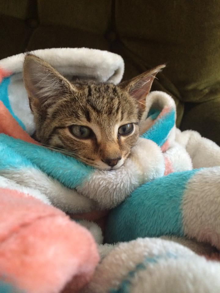 We had him wrapped in a blanket on our tiny couch, and food and milk were brought up to him so that he didn't have to move at all. To anyone else it would have been the life of luxury, but he still fought us every time we took him to the litter box. The poor baby we terrified of anything that moved.