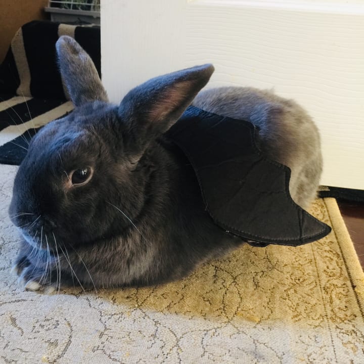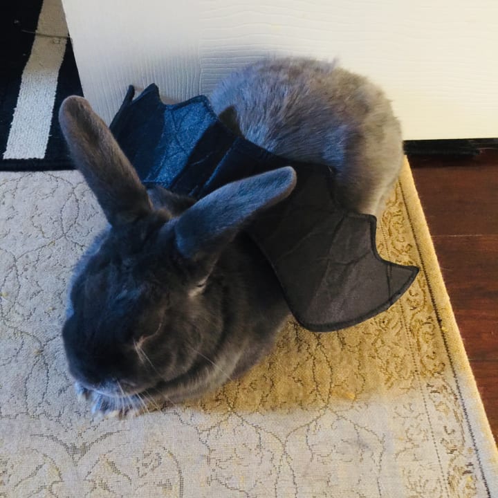 Freyja has been my beloved bun bun for five wonderful years. She was barely the size of an Easter egg when I brought her home and now she is a full-grown lady! I'm pretty sure she thinks that she's a cat as her homecoming coincided with a litter of new kittens. They grew up side by side and she became their long-eared sister. Freyja is not a fan of costumes or anything that invades her belly space so I decided to gently place these cute little wings on her back instead. She settled right in, posing pretty for her big bat-bun photoshoot like the star she is.