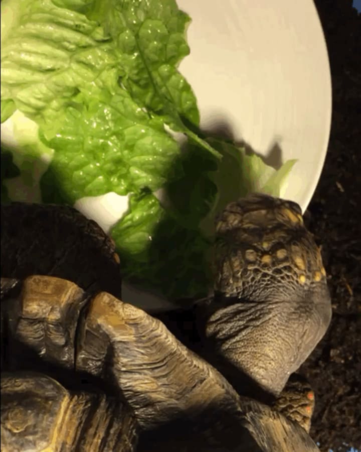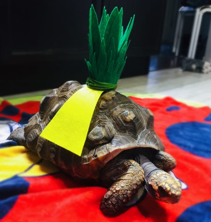 Okay, so he’s actually a red-footed tortoise. I like to tell people he’s my pet dinosaur. Harry is eighteen years old but has only been in my life for two of them. His previous home was no longer able to give him the time and support he needed to live his best life so Harry was adopted into our makeshift family. Working from home allows me to give him full-time supervision and the attention he craves.