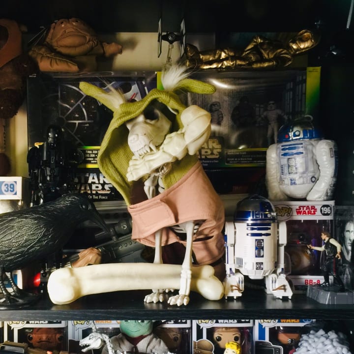 Before I was able to have a pup of my own I found this adorable little skeleton dog. I dubbed him Bone Doggy and dress him up each year as Yoda. Little kids get a kick out of him and watching my cats “introduce themselves” was a blast! He will always be a member of our spooky little family so I wanted to make sure he wasn't left out.