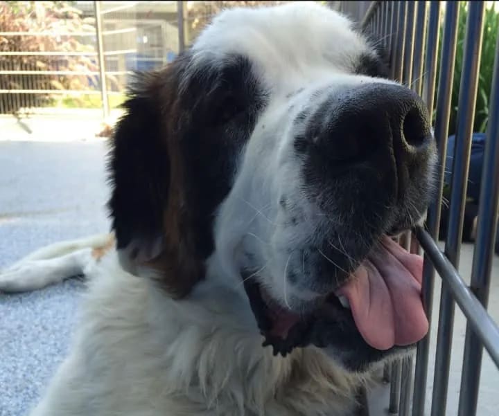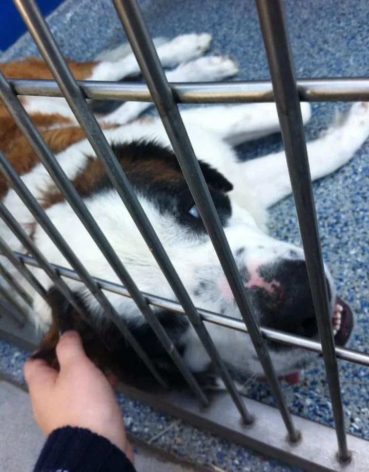 One day a friend talked me into going to the shelter to look at cats. Before we left my mom said “Don’t send me any pictures, we are not getting any more animals” I agreed, as I didn’t want a cat and that is what we were going to look at. We arrived at the SPCALA to look at the cats. This is such a beautiful shelter, and we were having a blast spending time with the available cats in the cat rooms. My friend talked me into walking around and peeking at the dogs. I didn’t see any harm in looking, as I only wanted a young Saint Bernard. We walk towards the dogs and what is the first dog I see? A Saint Bernard. He was very skinny and I convinced myself he was probably old and sick, that’s why he ended up at the shelter. We walk in to read his information. A year and a half old Saint Bernard. Dang it. Our eyes met and I noticed he had one dark brown eye and one stunning blue eye. We stared at each other and I knew he was my dog. We didn’t end up looking at the other dogs, I sat with this Saint Bernard for over an hour.