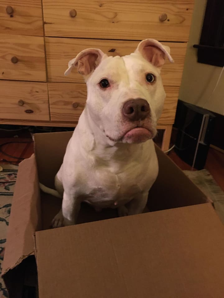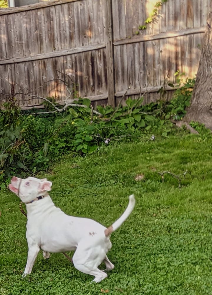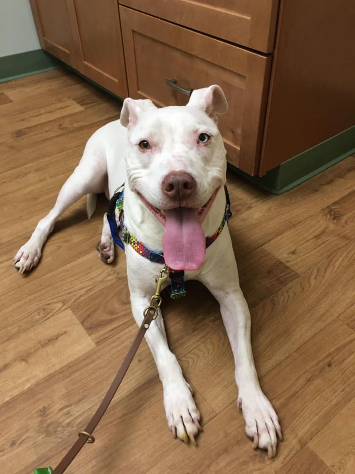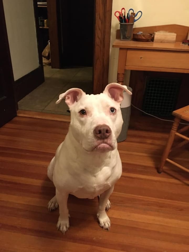 Hitch isn't my dog. He lives upstairs with his person, Alex. Hitch is a deaf Pitbull mix who responds to sign language commands. He's a cheerful, friendly dog who thinks everyone is going to be his New Best Friend.