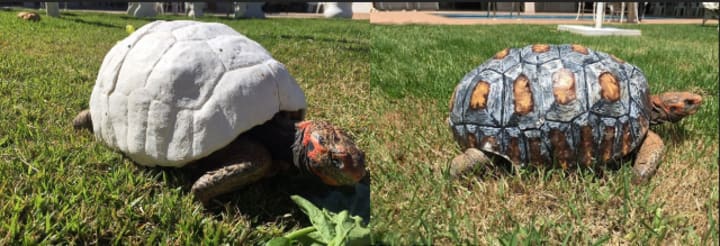 Freddy's shell was painted by the Brazilian artist Yuri Caldera so that she would fit in better. Caldera didn't try to "pimp" the 3D-printed shell. Instead, he used her natural colors to make it look more like a natural shell.
