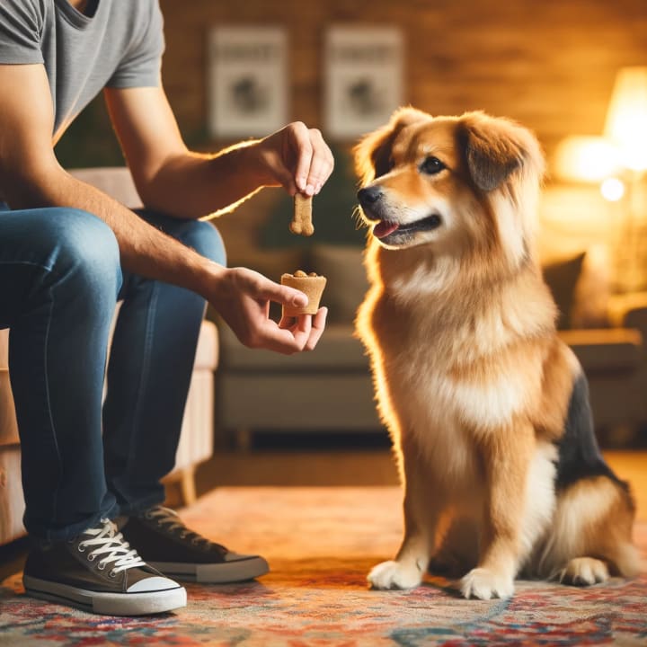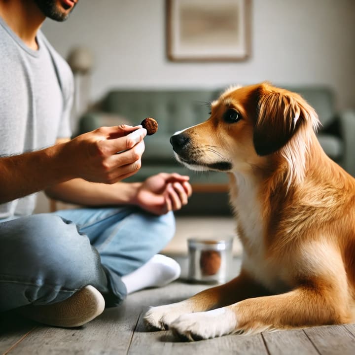 1. Start by placing a treat in your hand and show it to your dog.