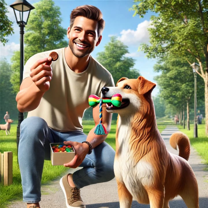 1. While your dog is holding a toy or another item, offer them a high-value treat.