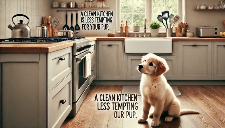 Don’t leave dirty dishes or crumbs lying around. A clean kitchen is less tempting for your pup.
