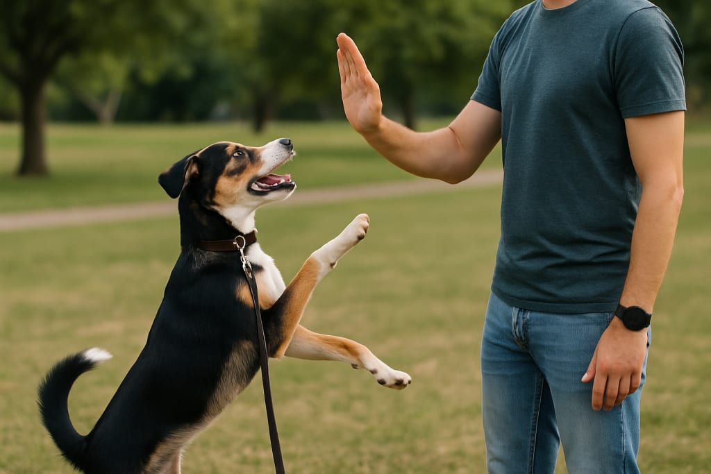 Dogs jump to get close to you. Give them that closeness — just in the right way. Kneel. Cuddle. Reward the calm.