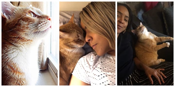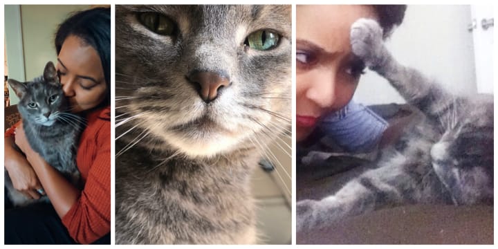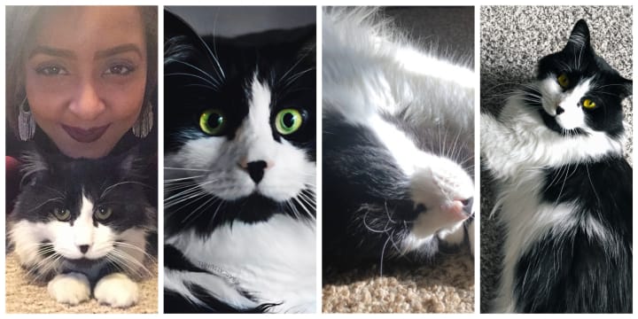 Our second rescue, this time from an animal shelter. He is the youngest but tallest and largest of the bunch (he is the size of a small dag). He is quiet, loyal, will come immediately when you call his name from anywhere in the house, and his spot on the bed is on the pillows in-between mine and my fiancés head. We usually either get a cat foot in the face or a warm nose by your cheek upon waking.