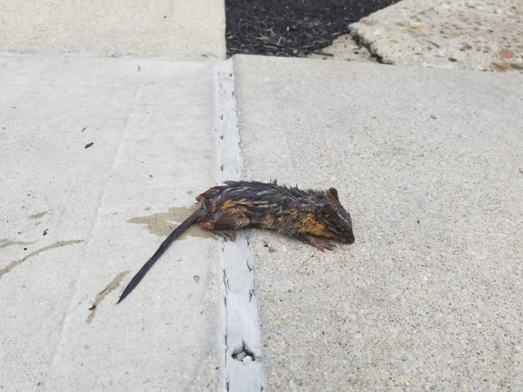 When I was leaving work that day, I noticed a drenched chipmunk on the sidewalk. I assumed, quite frankly, that the animal was dead, perhaps having drowned in the heavy rains from that afternoon. I nudged the body gently with my foot. To my surprise, it tried to run away.