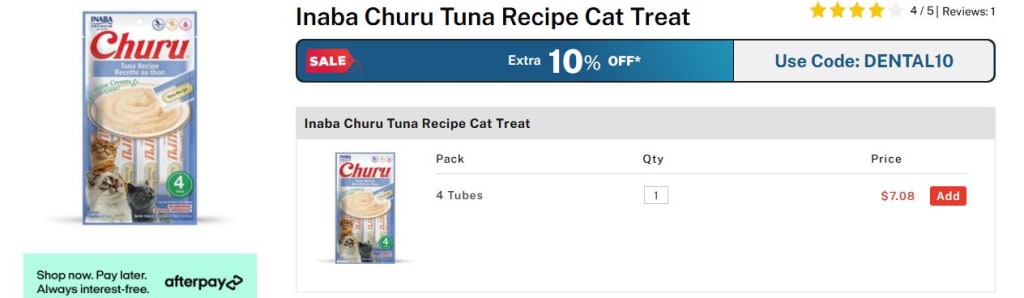 This is a soft, lickable purée treat for cats, made primarily with tuna. It comes in easy-to-use tubes that you can hand-feed directly or squeeze over your cat’s food.