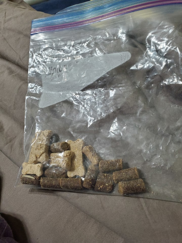 At 8 PM, she gets a couple of tiny dog treats after her last nightly trip to the backyard.