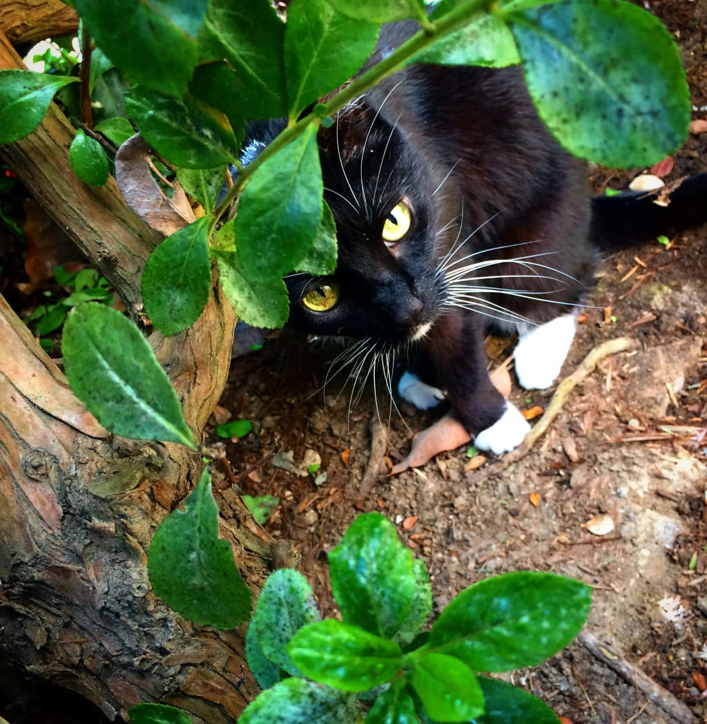 Jamie lies down on her bed and looks out the window to see the pear tree in her yard covered with blooming white flowers. One day a few years ago, Jamie couldn’t find Jackie anywhere in the house. She frantically searched all over the yard and around the neighborhood for hours, until she heard a sad, drawn-out meow coming from the pear tree. Jamie looked up into the blooming tree but couldn’t see Jackie past the cotton-like flowers. It wasn’t until Jamie climbed into the tree and stood above some of the branches and their little clouds that she was able to see the little cat perched in the tree.
