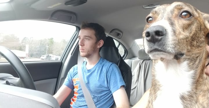 This isn't posed... This is how he rides in a car.