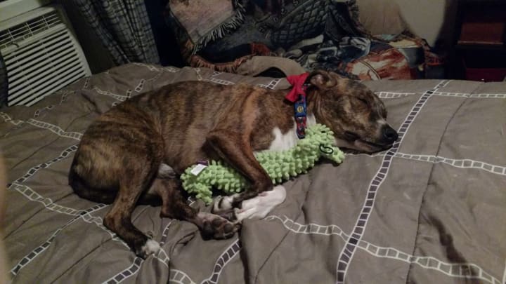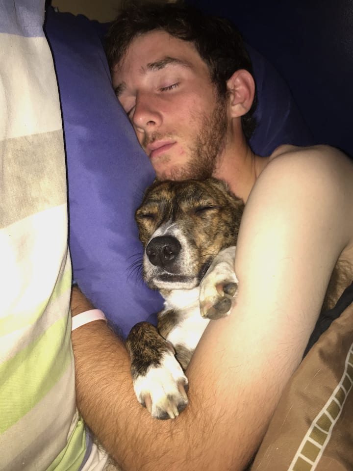 Kermit sleeps with us every night. Correction*- Kermit sleeps in between us every night. He lies the long way with his little pinhead resting on a pillow and snores himself to sleep. In the mornings, he's like a little kid waking up early on the weekends. The second he sees me move an inch, even if I'm just randomly waking up for a second to check my phone, he comes crawling to me, licking my face, and plops down right on my chest... every morning, besides a few days ago when he did all this but literally laid down with all his weight on my face instead.