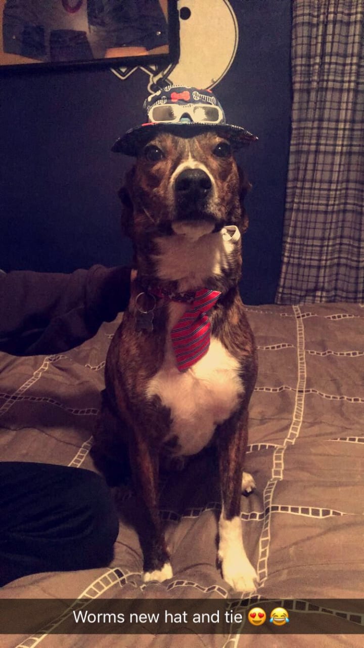 Oh, admit it. We all do it. It's fun exploiting your doggo or your baby and making them look ridiculous for our own sick pleasure. And this is only one example... we've put Kermit in a Pickachu costume, football player costume, a baseball cap, my glasses, Tyler's golf shirt, a jersey, dog walking booties, you name it. We literally only bought this hat just to see how hilarious he would look and then returned it. At least Worm knows how to perfectly pose for a photo.