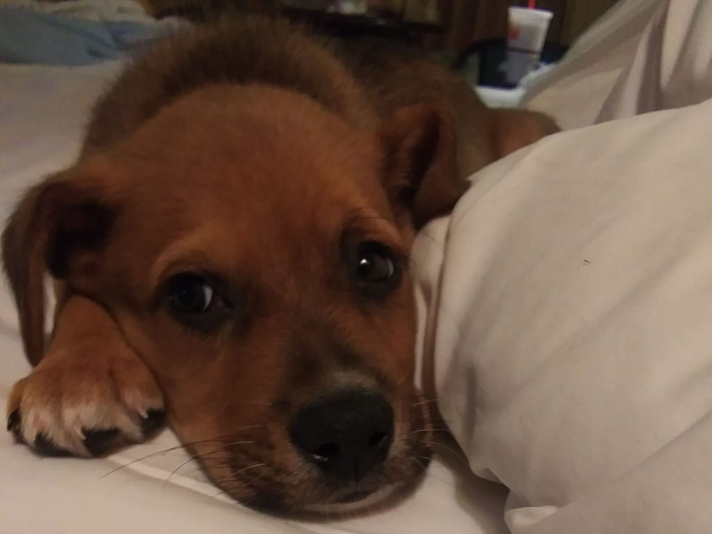 I was so lonely after my husband and I split up. After being married to someone for over 25 years, being by yourself is more than just a culture shock to the system. I went to stay in my best friend Jimmis' childhood home. The house was much bigger than I was accustomed to. After a few short weeks of getting settled in, the feeling of being in solitary confinement was more than anyone could bear. So I bit the bullet and decided to get a puppy. I did not care what type of dog he or she was. I just needed something or someone in my life and would never leave. Be loyal and faithful to only me. Luckily one of my dear friends came by one day with a surprise. As I looked in the box there was the most precious, adorable face I had ever seen. I immediately picked him up and knew he would be all I would need to make it through the day. As I held him his name just came to me. Loki! I will name you Loki, the God/Dog of tricks and mischief.
