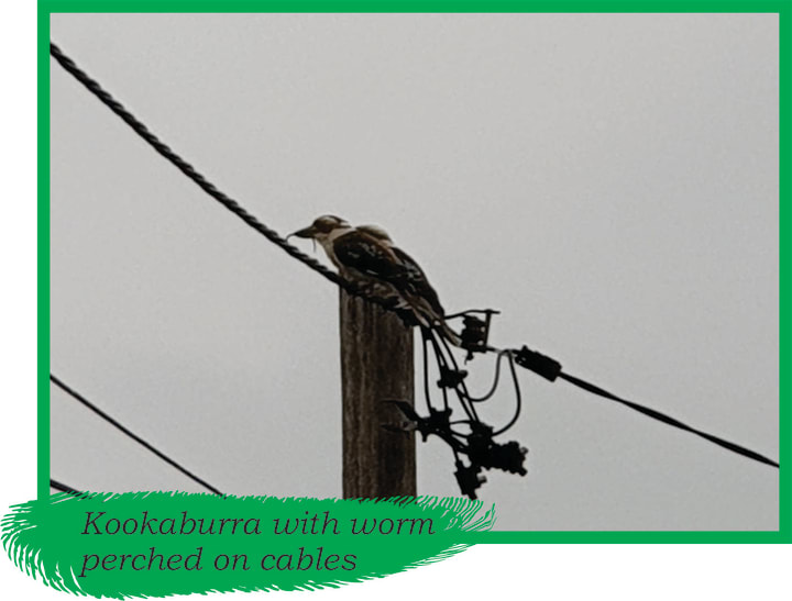 I have since seen 4 Kookaburras together in our area but they are very scarce, I spot them mostly in the early mornings perching on electric cables as I drive hubby to the station.