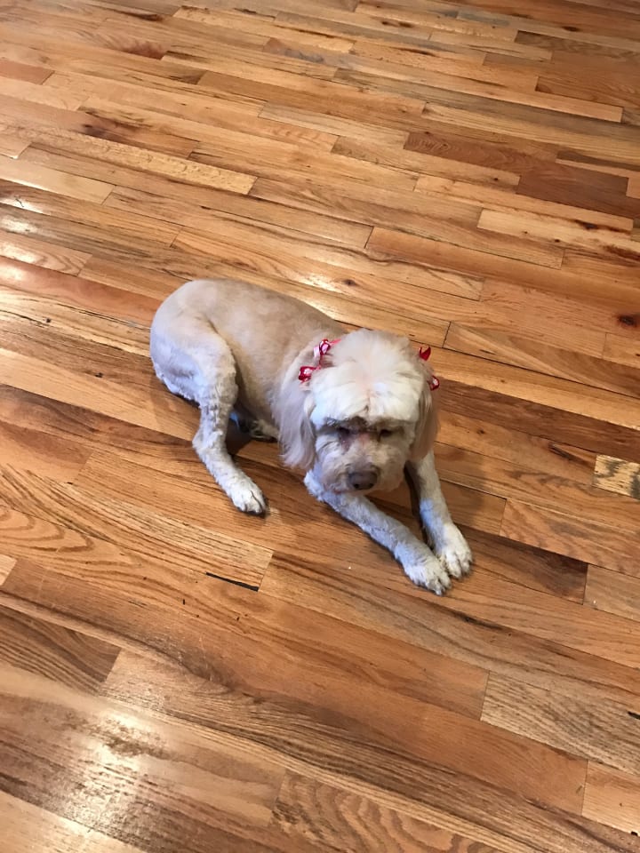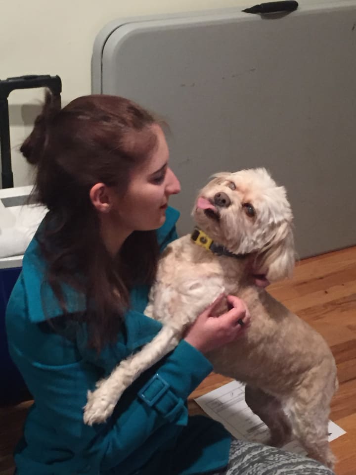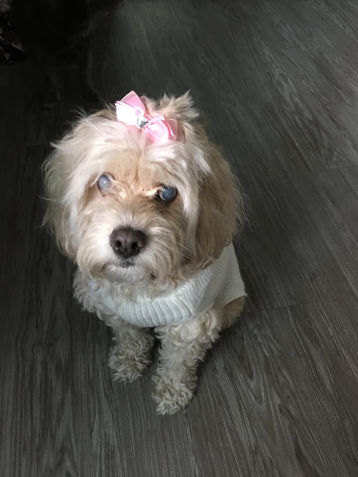She was a 12 year old cockapoo in New York named Lucky. Her family couldn't keep her anymore and they were looking for someone who would be willing to take her and give her a good home so she wouldn't have to go to a shelter. They wanted to avoid this at all costs because they were afraid she wouldn't get adopted, not only due to her age, but because she was blind.
