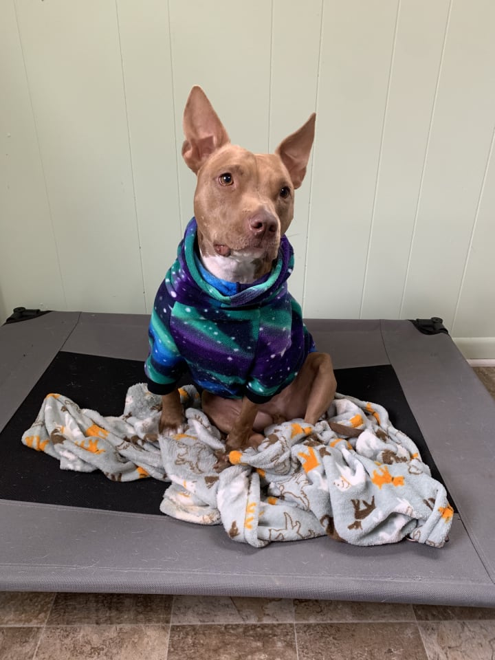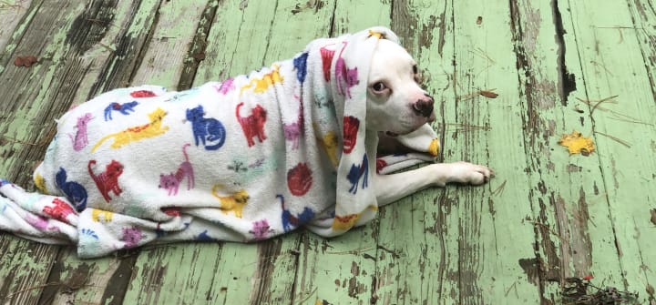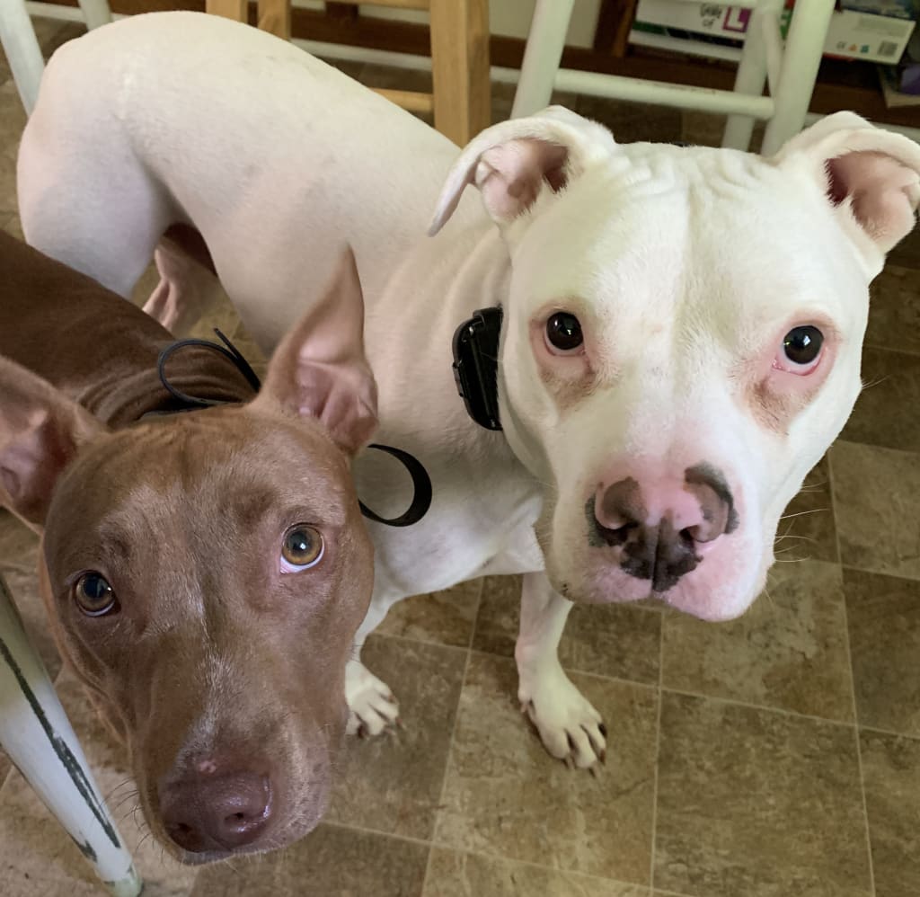 Thankfully, I work from home most days, so I’m able to care for them, but they also take up a lot of my time. I have two pit bulls that I rescued, and both were found in poor condition. We’re not sure what happened to them, but my little one, Bobby (literally 27 pounds when we adopted him and was full-grown, while emaciated), seems to have spent most or all of the 8 months before he was taken to the shelter on the streets. He’s a scavenger and has literally eaten a baby bunny, a bird egg, a rotting toad, a dead mouse, bugs, and I’m sure a lot more. He seems to have had a hard time, as he has several scars and a few that look like burns on his head.