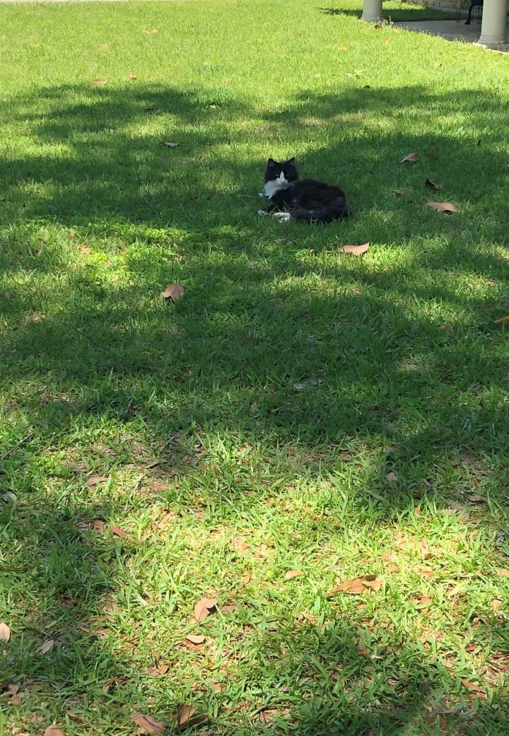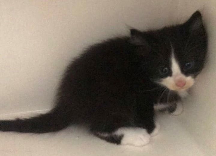 “There was no mother cat. No other kittens. This little black and white fluff ball was under the bush all alone crying,” she said. “I think it’s very young.”