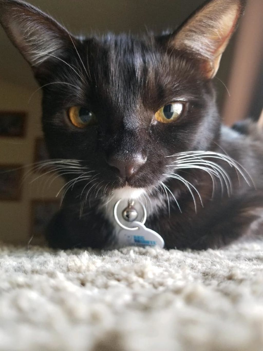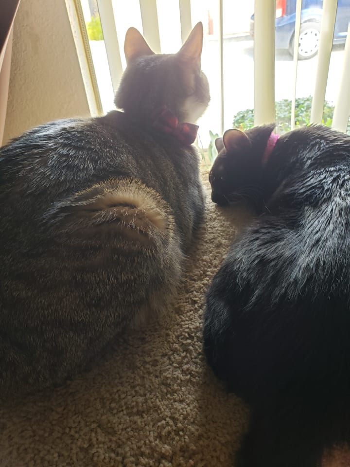 Mittens brings a much-needed light into our lives during this pandemic. She is talkative, sassy, and sweet. Her purrs as she curls up to my head at night keep me happy during such difficult times. She is always just happy to be included in the house. After about a week, Blinky accepted her. They snuggle and play now like a classic brother and sister duo. Blinky has calmed down some, with a more friendly feline presence in the house. She learned from him to harass my sister for food and use the litter box (there were some rough stinky days). We joke that she is our very own emotional support animal.