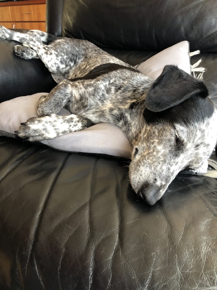 A few minutes after walking through the kennels, he called me over to see a small spotted dog with shining blue eyes. The first thing I noticed was her eyes that glimmered like blue diamonds. Around her right eye, she had a black pirate patch with matching black ears. She had a funny frame with short legs and a long torso like a dachshund. Paired with black and white spotted fur like an Australian shepherd or heeler. Needless to say more, I was in love!