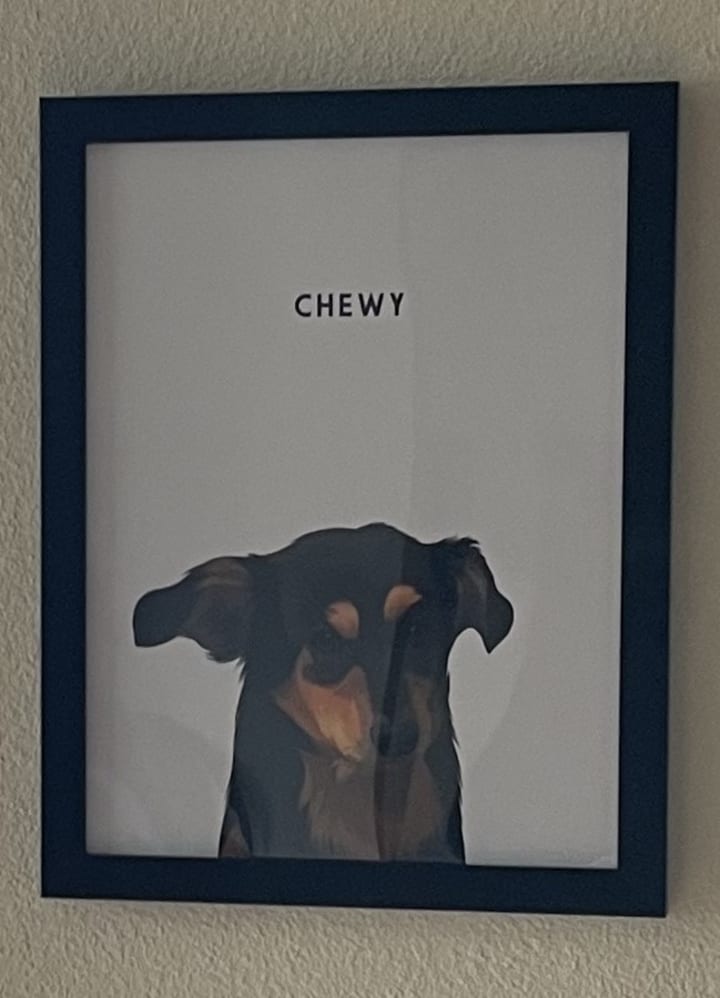 Yesterday, we received a beautiful gift from our daughter. It’s a portrait of Chewy by West & Willow. Our daughter submitted a photo and West & Willow did a custom illustrated pet portrait. They sure captured the essence of Chewy and the expression in his eyes. We love it. The photo I took does not portray it well. I had a hard time getting a snapshot without shadows. This was the best I could do.