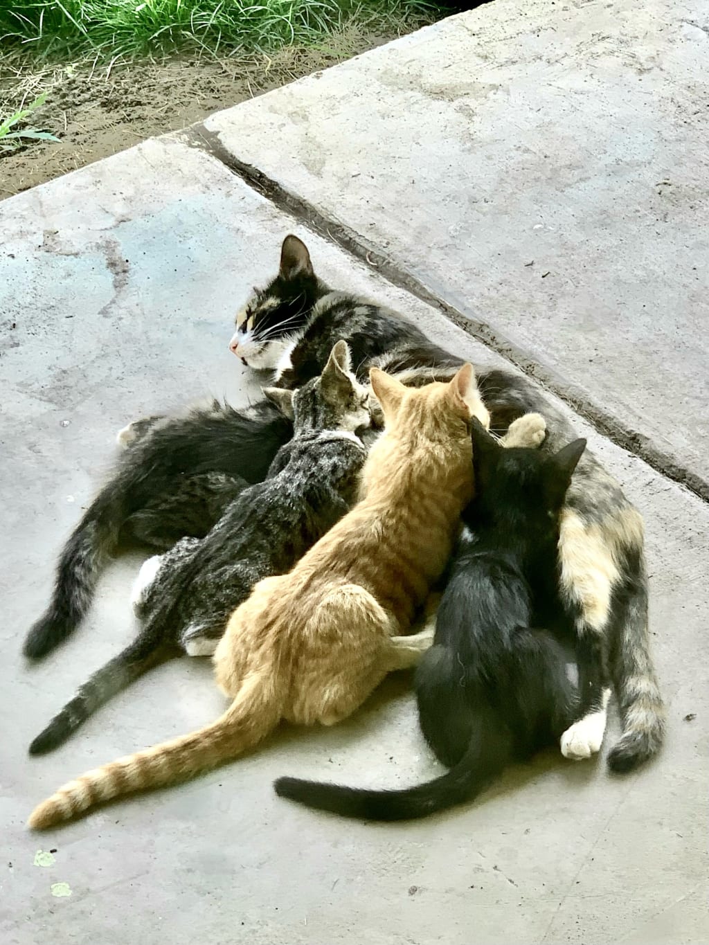 We finally decided it was time to get rid of them. This lifestyle was good in the early stages, but it couldn't go on as they got bigger and more entitled to the food we gave them as they weaned from their mother. After too long, there's several half-grown cats on the porch making a ruckus, climbing the screen door, meowing. Back to the math; that's several too many. We gave 3 away to friends and family with little kids. Free pets are often good pets. 2 of them are in Nevada now, one of them is at a farm nearby. They lucked out in a big way.
