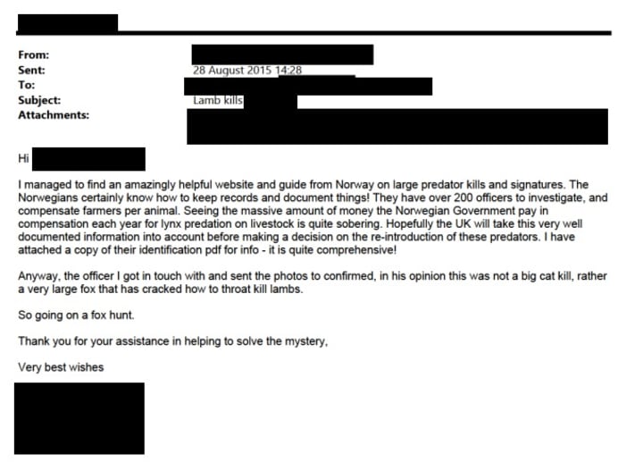 One of the leaked emails reveals that a review of the financial expenditure and resources used by the Norwegian government in compensating their farmers for livestock killed by their native ‘Northern Lynx’ was described as “sobering”; with the additional suggestion that parties in Britain promoting lynx re-introduction programmes should “take this very well documented information into account before making a decision on the re-introduction of these predators” – but also within the 86 pages of emails is evidence that THE LYNX IS ALREADY HERE and has been for “some 30 years”!