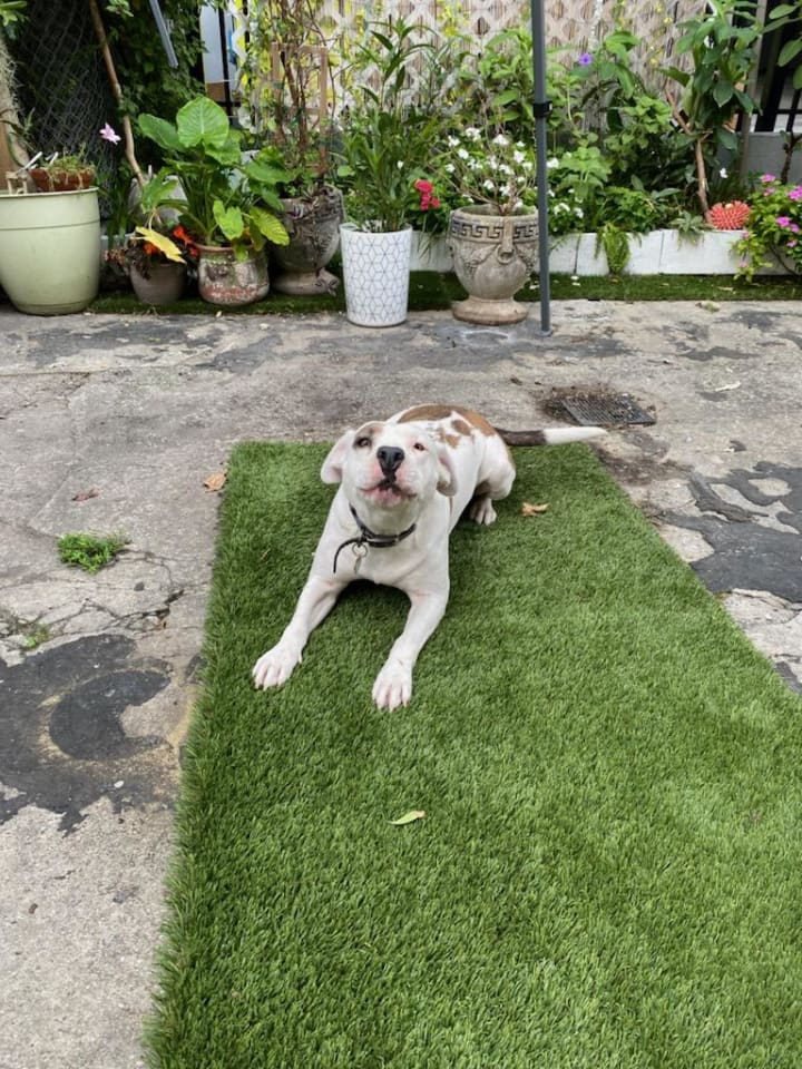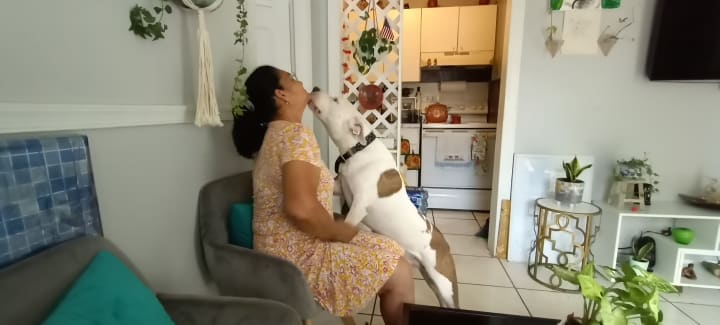 Ranger gives the sweetest kisses and makes the funniest expressions when he knows he is in trouble. There are moments when abuela finds out he chewed a sandal up; he immediately sinks his head and hides underneath my chair. Of course, abuela would get mad but Ranger knows how safe he is with his mama. Ranger is also very vocal and expressive; he lets out beautiful, bellowing howls as a gesture of saying "Good Morning," when it's breakfast time. Nothing is funnier than when a 45 pound dog leaps in your lap as if he's a 6 pound kid and bombards you with face-licks. Looking into his eyes, all you can feel is the sweetness in his soul.