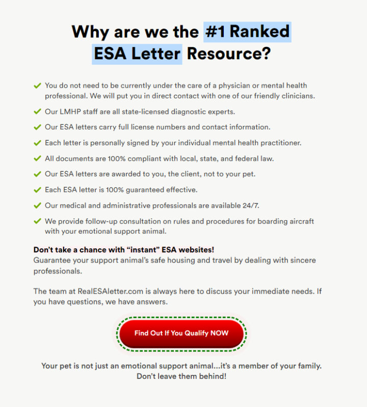 RealESALetter.com employs only licensed mental health professionals who are qualified to assess an individual's need for an ESA letter. This ensures that the letters they provide are legally compliant and recognized by housing providers and airlines.