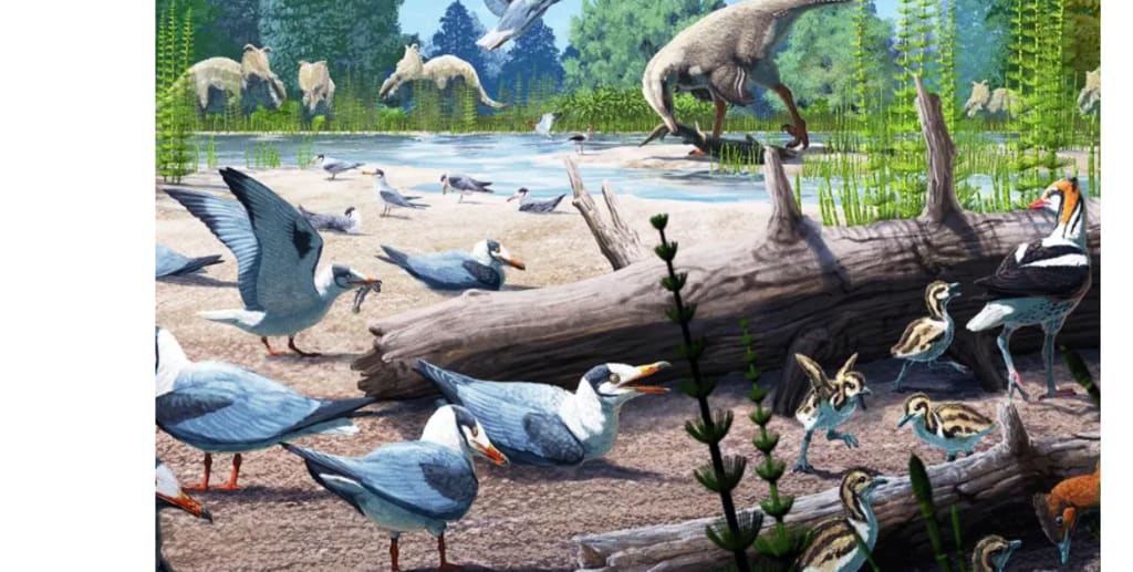 A depiction of birds from the Cretaceous Period with other dinosaurs from the same era in the background. The oldest known instance of birds breeding in the Arctic regions is documented in a paper published in the journal Science. To enlarge the image, click it. Gabriel Ugueto is credited.