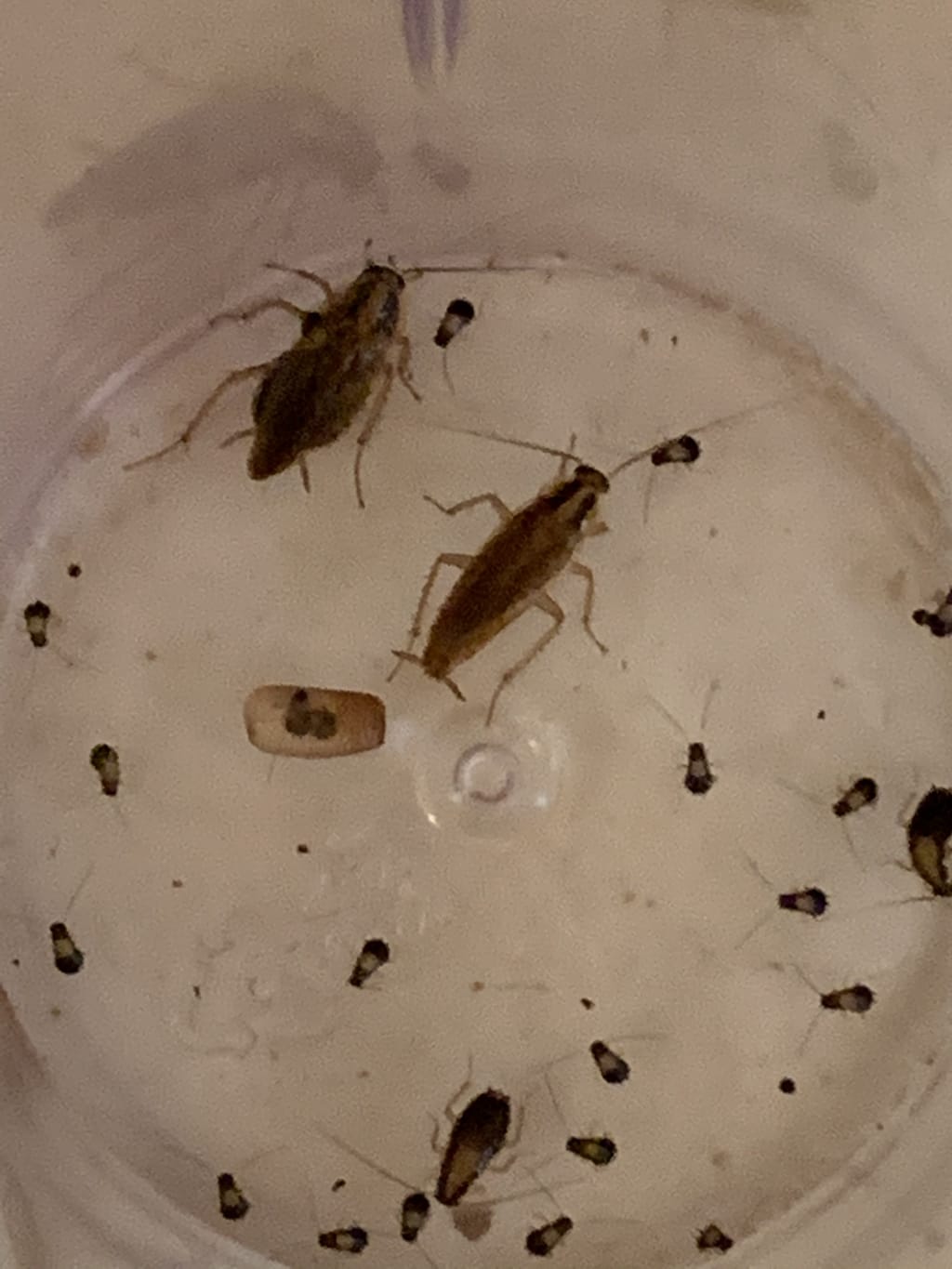 The next day after that, an object was also in the cup. The object looked to me like a capsule-shaped translucent egg. The next day after that, a lot of baby roaches were also inside the cup. Therefore, the egg-like object probably hatched the baby roaches. The baby roaches, however, might have crawled inside the cup from the counter. The next day after that, a second immature roach of a slightly different size and shape than the first immature roach was also in the cup. The next day after that, two dark spheres looked to me to be inside the egg case. Later, the dark spheres looking to me to be inside the egg case were gone and the egg case looked to me to be empty again. Later still, I noticed that baby roaches crawling underneath the egg case looked like dark spheres inside the egg case.