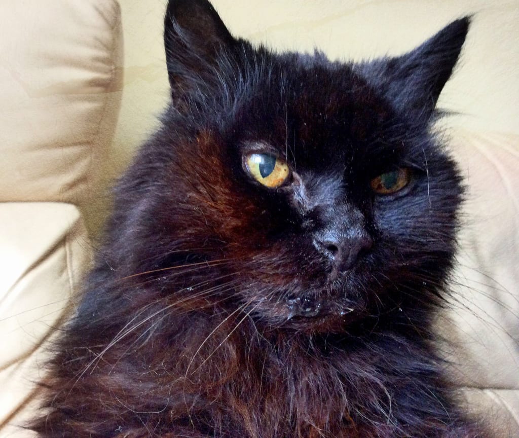 This is a picture of Charlie looking very healthy after a year of lots of love and food. Charlie was rescued by Feline Cat Care Rescue Charity from a cat hoarder who had twenty other cats. Charlie had Feline calicivirus that was left untreated. Because of this, he had trouble eating, leaving him incredibly thin and emaciated. I took one look at him and adopted him. Although I had to wait two months before they would release him. Every Sunday I would spend time with Charlie getting to know him. Even though he was mistreated, he was a loving cat ready to trust again.
