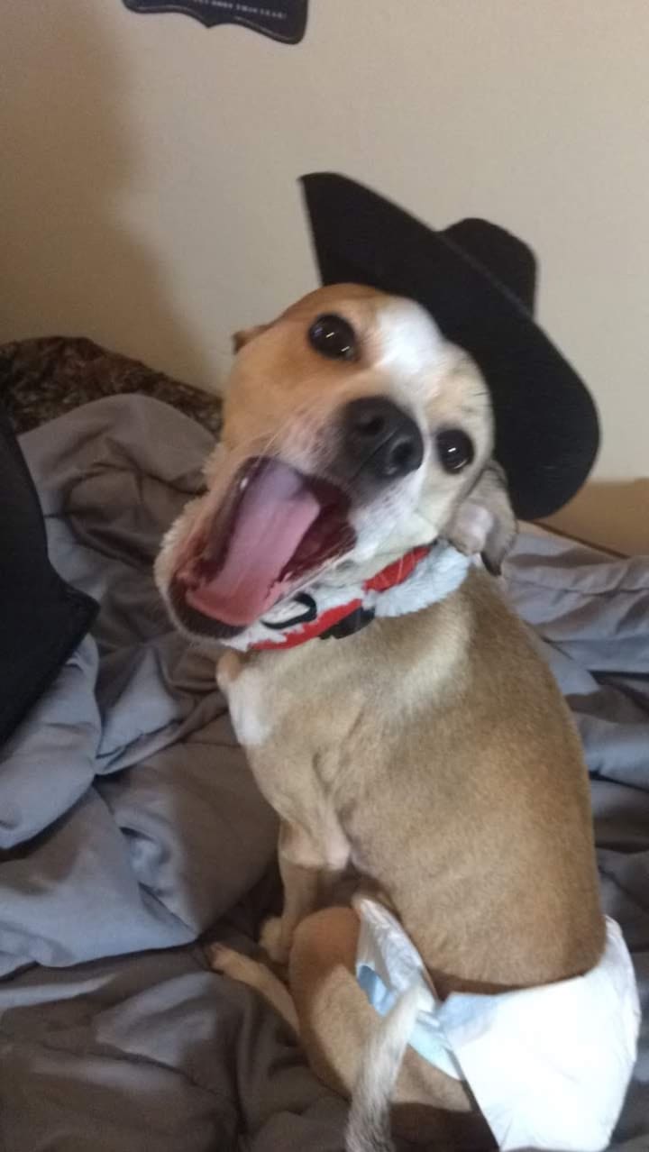 I basically only brought the outfit/costume to take pictures of this dog, Harley, in if I'm being quite honest. It was definitely worth it. Although Harley was able to slip out of the hat in .02 seconds and flip the costume over so that it hung upside down over his body as he ran about the house trying to take it off, at least I still managed to get a damn cute memory in the process for the day we no longer will be in each other's lives. I didn't know it at the time, but that day was coming quite rapidly and I am proud of this moment.