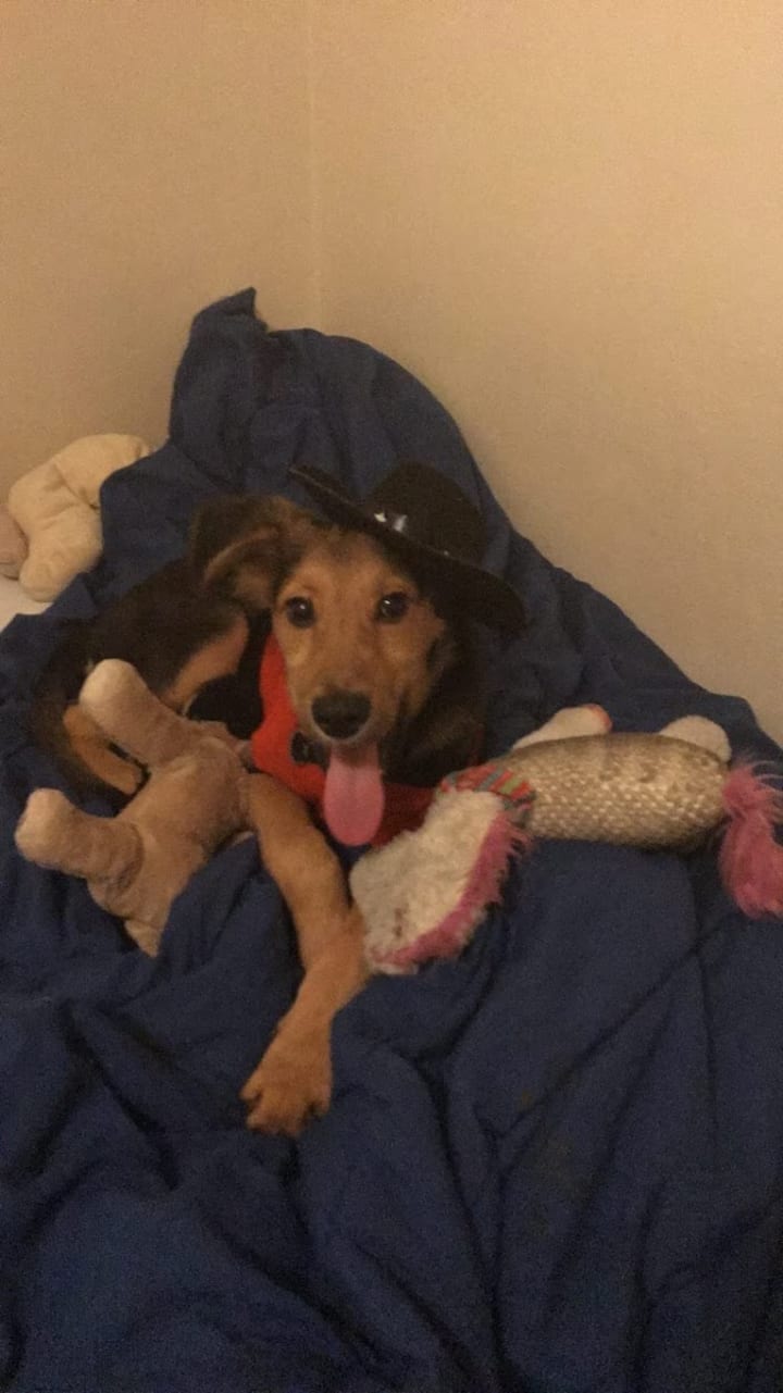 If you saw a previous work I written for this same challenge about my current pup's last Halloween costume, you would have seen that I mentioned a Halloween costume seen on this pup from a photo I had found (Article found here). After doing a bit more looking, I actually found another costume that this dog had worn in the time he and I were in each other's lives. This was a costume I found at PetSmart in the "Clearance" section one day when my mom and I went one night close to closing time for some dog food- I just knew I had to buy it the very second I found it. I was not putting it back on the shelf.