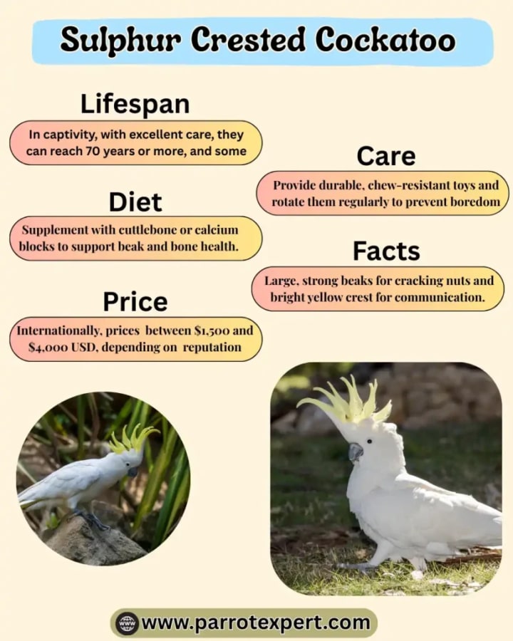Sulphur Crested Cockatoo as a Pet: Size, Lifespan & Care Needs