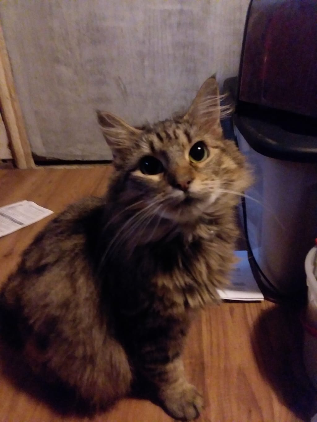 Honey showed up around January of 2019 and befriended my grandfather through a can of tuna fish. A tiny mane coon mix stray with a knack for befriending anyone she came in contact with. With it being winter it was still cold so my mom would let her curl up in her lap. One day my mom went to move her and saw her lap covered in this white liquid; from there we realized Honey had an infected wound on her back leg and we took it upon ourselves to help her heal.