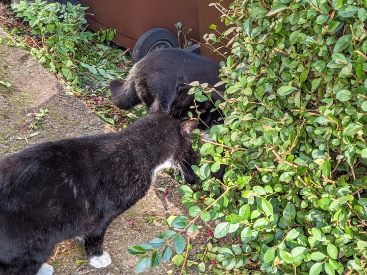 Today a cat I can guarantee to see on a daily basis turned out to be two almost identical cats as they were miaowing at each other as I walked past. I wasn’t sure if this was going to be a cat fight or if they were getting friendly, but I am not sure whether they are male or female but I will share my Instagram post of them below and maybe you can decide.