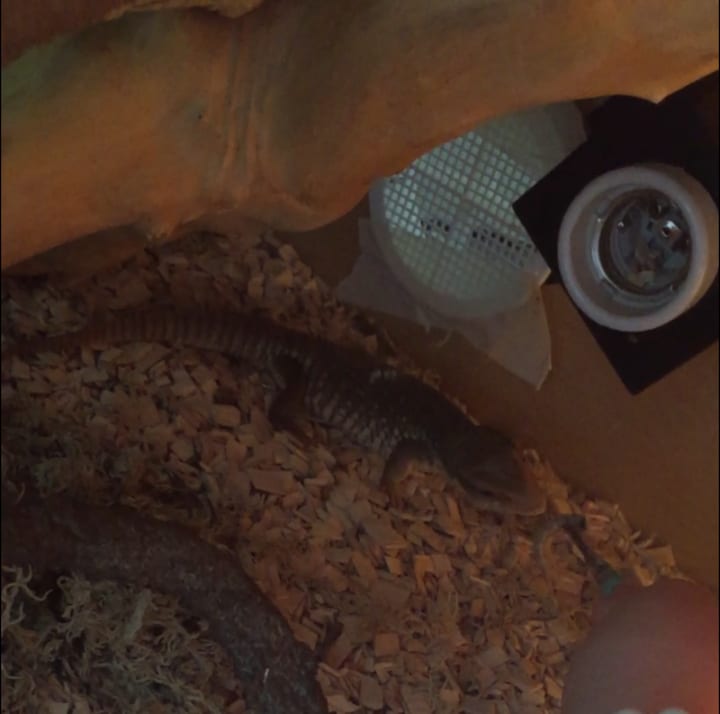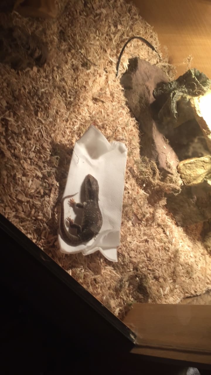 When Pablo arrived (at 4 AM might I add), he was no bigger than 6 inches including his tail. He was, of course, far darker than he is now, as they need more pigment as hatchlings for camouflage. And I just couldn't believe how small he was as I had no idea how old he was and had little to no information about him except that he was the last hatchling in his clutch left. I removed him from all his packaging and placed him inside his vivarium on the damp paper towel he was sitting on, allowing him to acclimatise to his new surroundings and explore at his own pace. To my surprise, within 15 minutes, he was wandering round, exploring his new enclosure including beginning to climb his logs and explore his hides. I then attempted to feed him a super worm, not at all expecting him to eat it bearing in mind he'd only arrived a couple hours prior, but he ate it without hesitation. Ever since day one he has been a brilliant eater and not too much of a fussy one either.